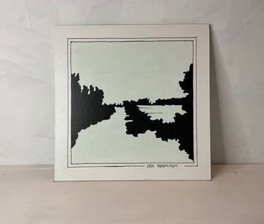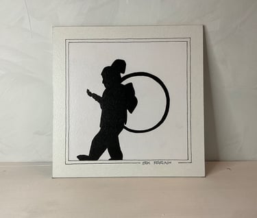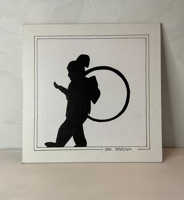 Omdat het strakke beelden moesten worden heb ik de schetsen op de Ipad uitgewerkt en overgetrokken om zo op een stukje MDF te krijgen. Ik heb eerst een plaat MDF tot stukken van 24x24cm laten zagen bij de bouwmarkt. Daarna schuren, reinigen, rondom in de grondverf zetten, schuren, reinigen en gesso aanbrengen. Omdat ik op elk plaatje dezelfde kaders van lijnen wilde heb ik daar een mal voor gemaakt. Zo kon ik met grafiet de lijnen van de kaders neerzetten. Daarna kon ik met een ouderwetse trekpen en verdunde acrylverf de lijnen erop zetten zonder liniaal (je mag best zien dat het door een mens is gemaakt toch?). Vervolgens met grafietpapier de afbeelding op de plaat gezet en vullen maar. Ik heb bij een aantal van de werken een subtiel beetje kleur gemengd in de lichte delen van de afbeelding. De verf die ik gebruikte is Golden SoFlat, vooral omdat ik goede dekking en een egaal oppervlak wilde. Maar dat spul bleek bij het aanbrengen van een vernislaag deels los te laten waardoor donkere kwaststrepen op de lichte delen ontstonden. Na een aantal werkjes te hebben verknald en een aantal keer testen bleek de volgende aanpak de oplossing te vormen. Eerst met kneedgum het hele oppervlak zo schoon mogelijk ‘rollen’. Daarna voorzichtig fixatief spray aanbrengen en dan pas de vernislaag erop smeren. Tot slot nog een haakje achterop plakken en klaar.