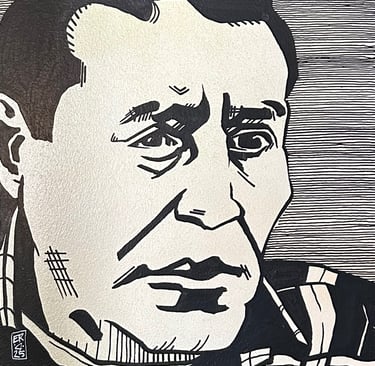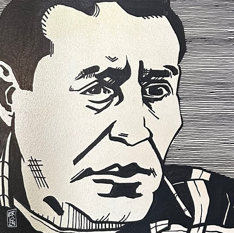 In een keer, met inkt. Ik maak een portretserie op panelen aan de hand van eigen foto’s. De referentiefoto voor dit portret is een toevallige omstander van een van mijn vakantiefoto’s uit Peru. Het werk is gemaakt met acryl inkt. Grotendeels met penseel, later wat details geplaatst met marker. Ik begin meteen met inkt, meestal met het rechter oog.