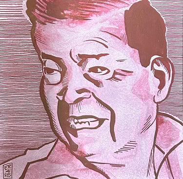 Ook weer een portret op paneel, direct met acryl inkt gemaakt. Ik vul een marker met dezelfde kleur inkt om na het penseelwerk wat details aan te brengen. Dit keer ook wat verdunde inkt gebruikt om schaduw toe te voegen als experiment. De foto die ik gebruikte is ook weer van een random persoon die toevallig op een van onze vakantiefoto’s uit Peru stond.
